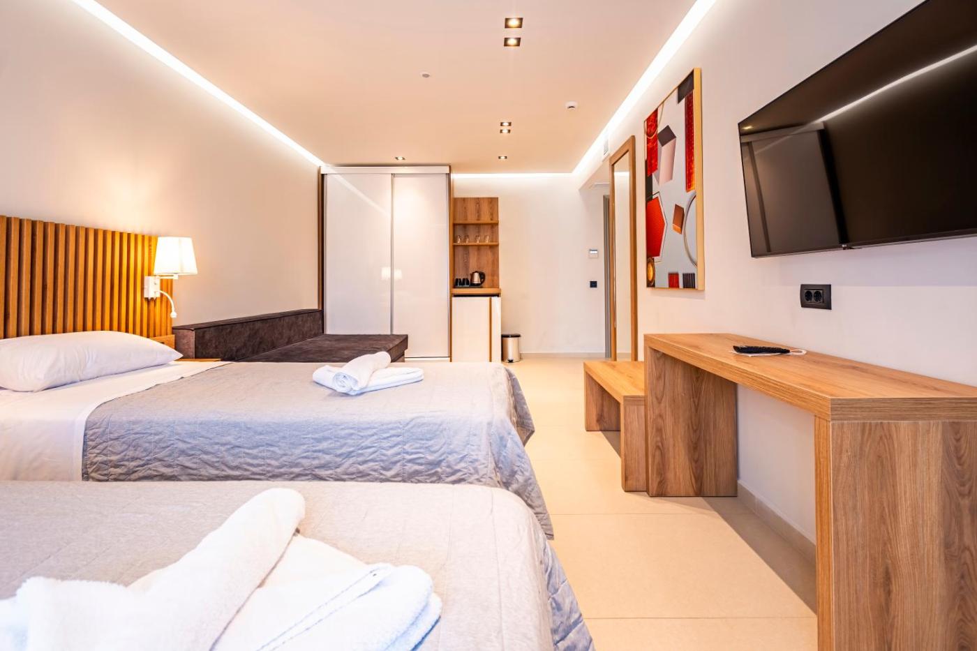 Deluxe Suite. Featuring a private entrance, this air-conditioned suite comprises 2 bedrooms and 1 bathroom with a shower and a hairdryer. Boasting a terrace with garden views, this suite also provides soundproof walls and a flat-screen TV with satellite channels. The unit offers 4 beds. ;
